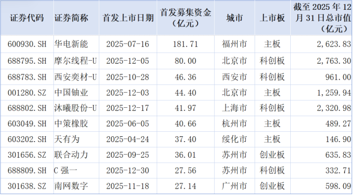 募资金额上,华新电能(600930.SH)以181.71亿元募资额居于榜首,其后摩尔线程(688795.SH)、西安奕材(688783.SH)、中国铀业(001280.SZ)募资金额分别约为80亿元、46.36亿元、44.4亿元;沐曦股份(688802.SH)则以41.97亿元募资额位列第五。前10名IPO公司募资金额合计约563.21亿元,占2025年IPO总募资金额的约43%。